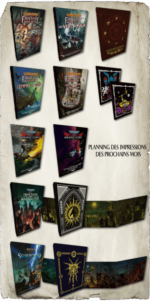 Nous sommes heureux de vous présenter le planning des impressions de Khaos Project pour les prochains mois. Tous ces ouvrages sont traduits, maquettés, relus et pour certains en cours de corrections. Il est encore trop tôt pour donner des délais précis, mais nous ne manquerons pas de communiquer au fur et à mesure que les impressions seront lancées.